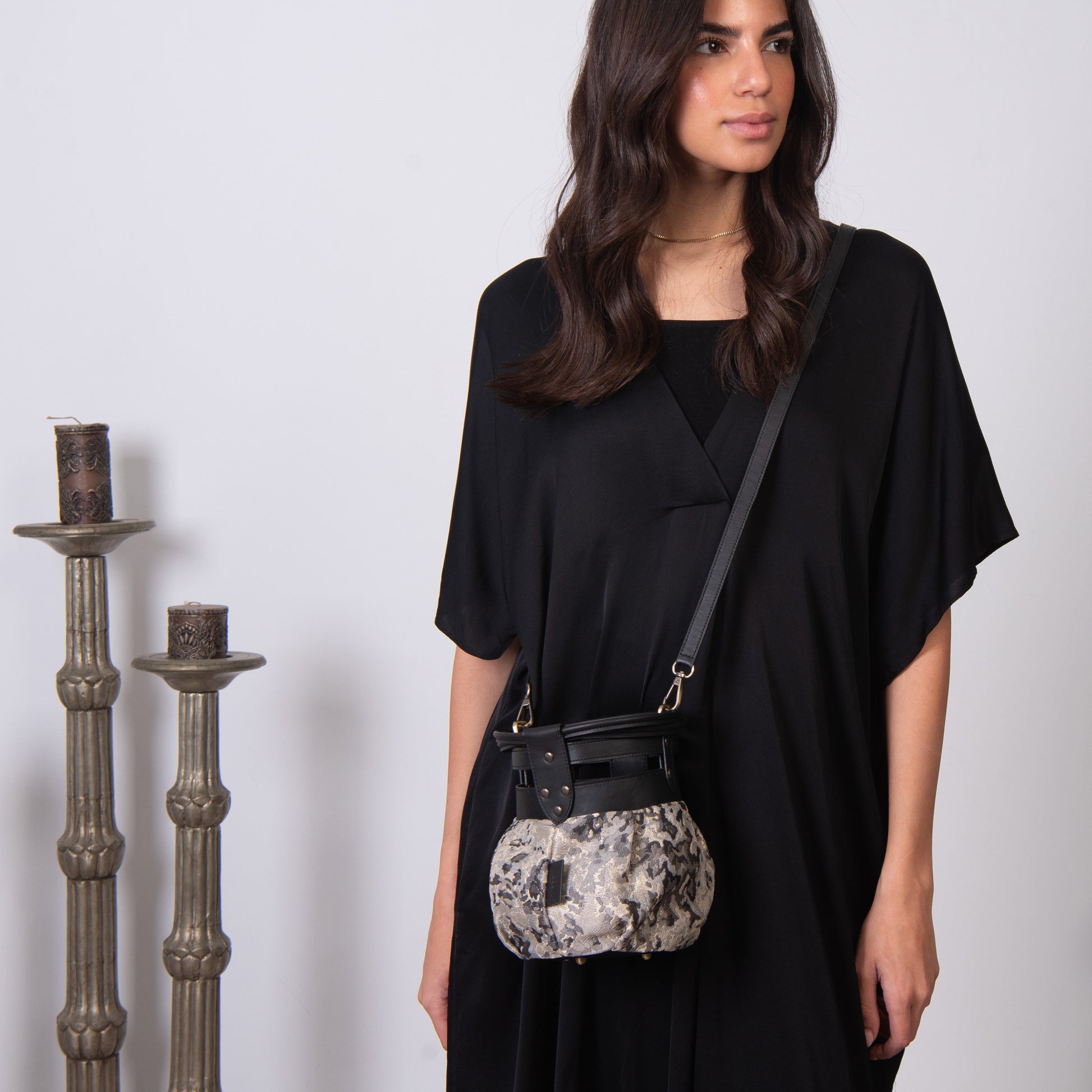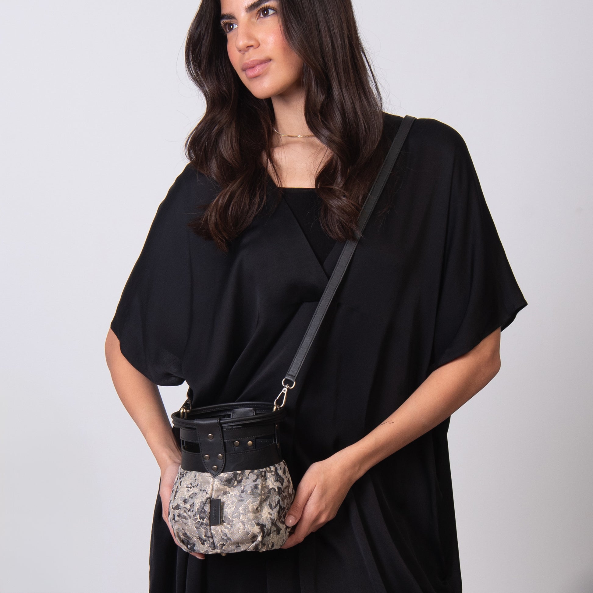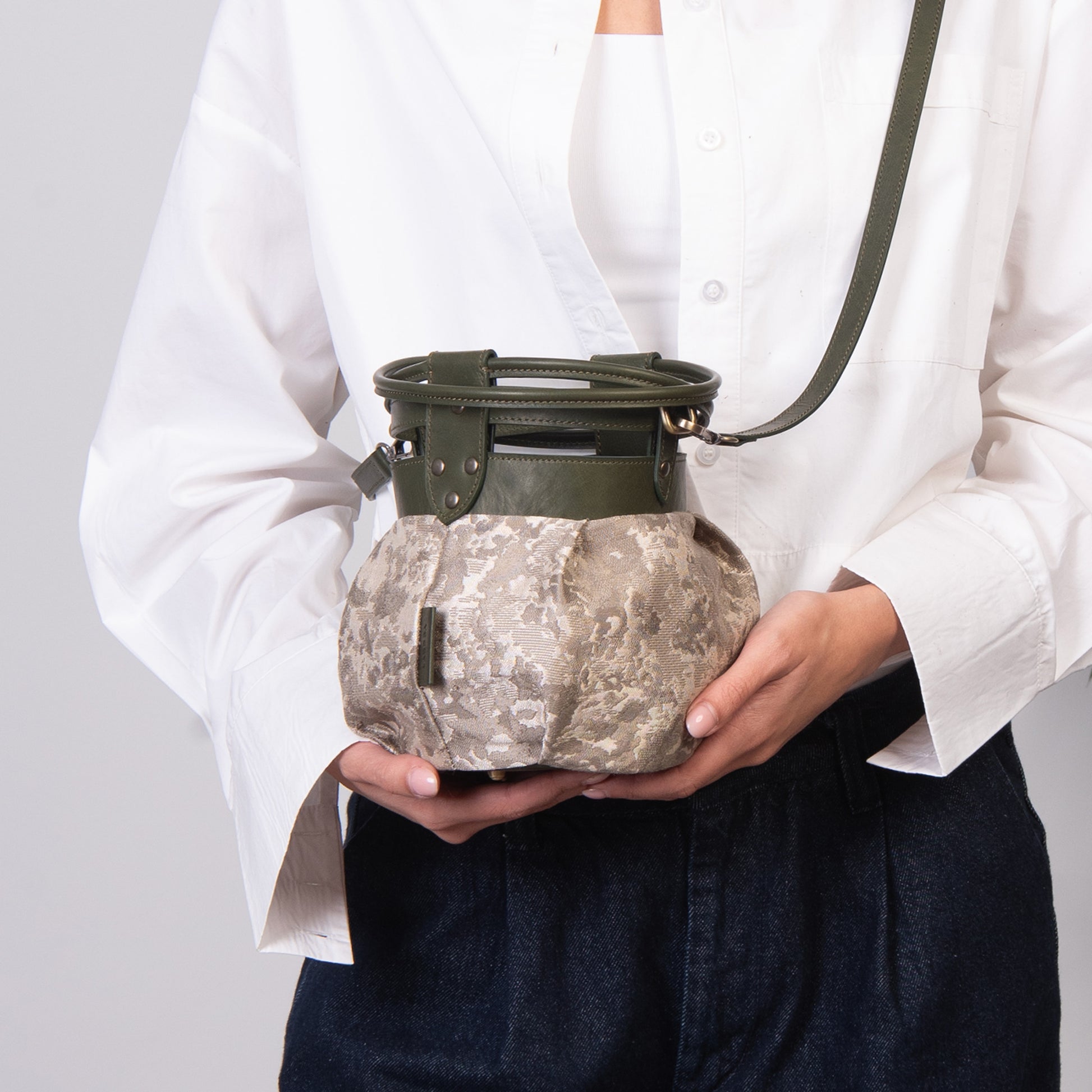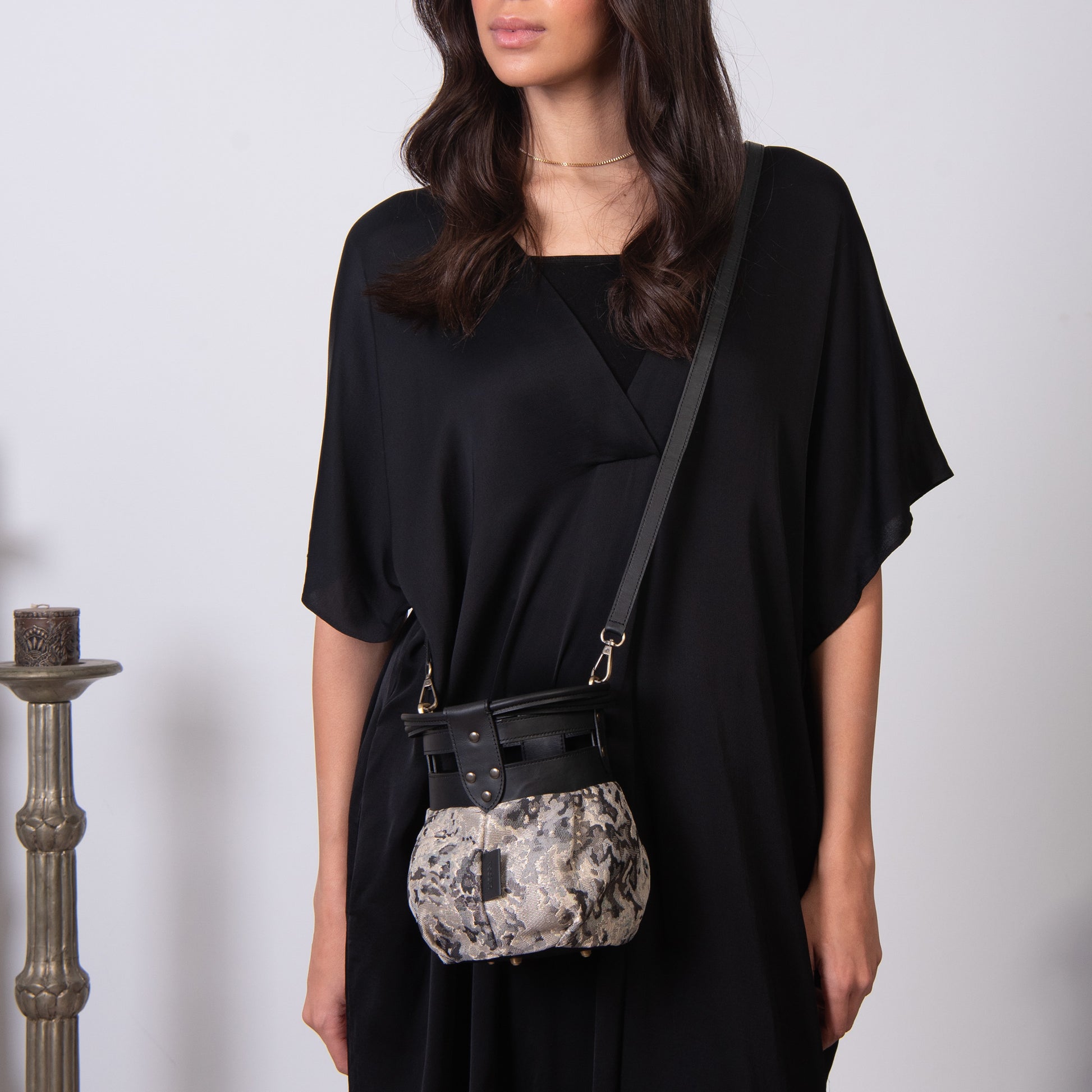 Fabric and leather in the intersection of the graceful and the tough. A round bundle that can easily be dressed up or down!