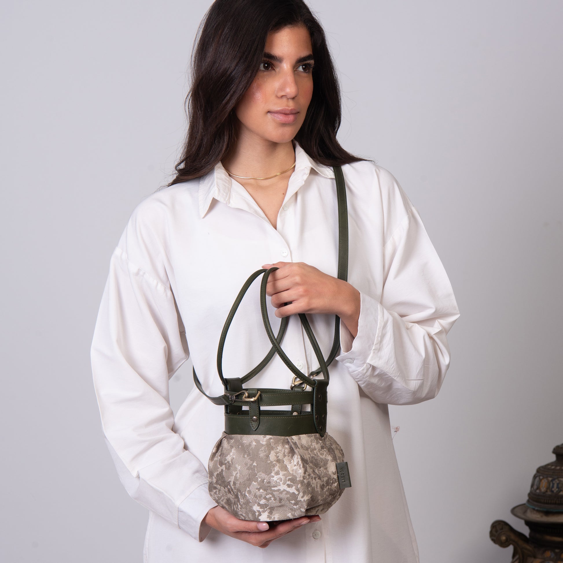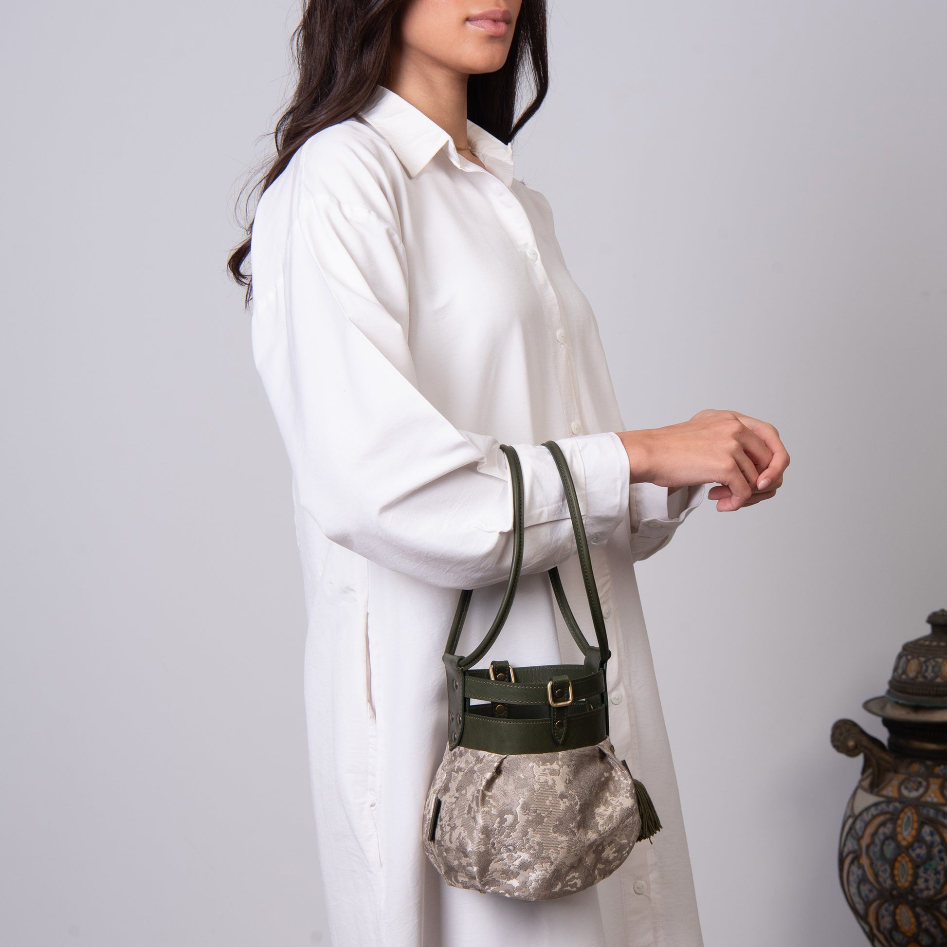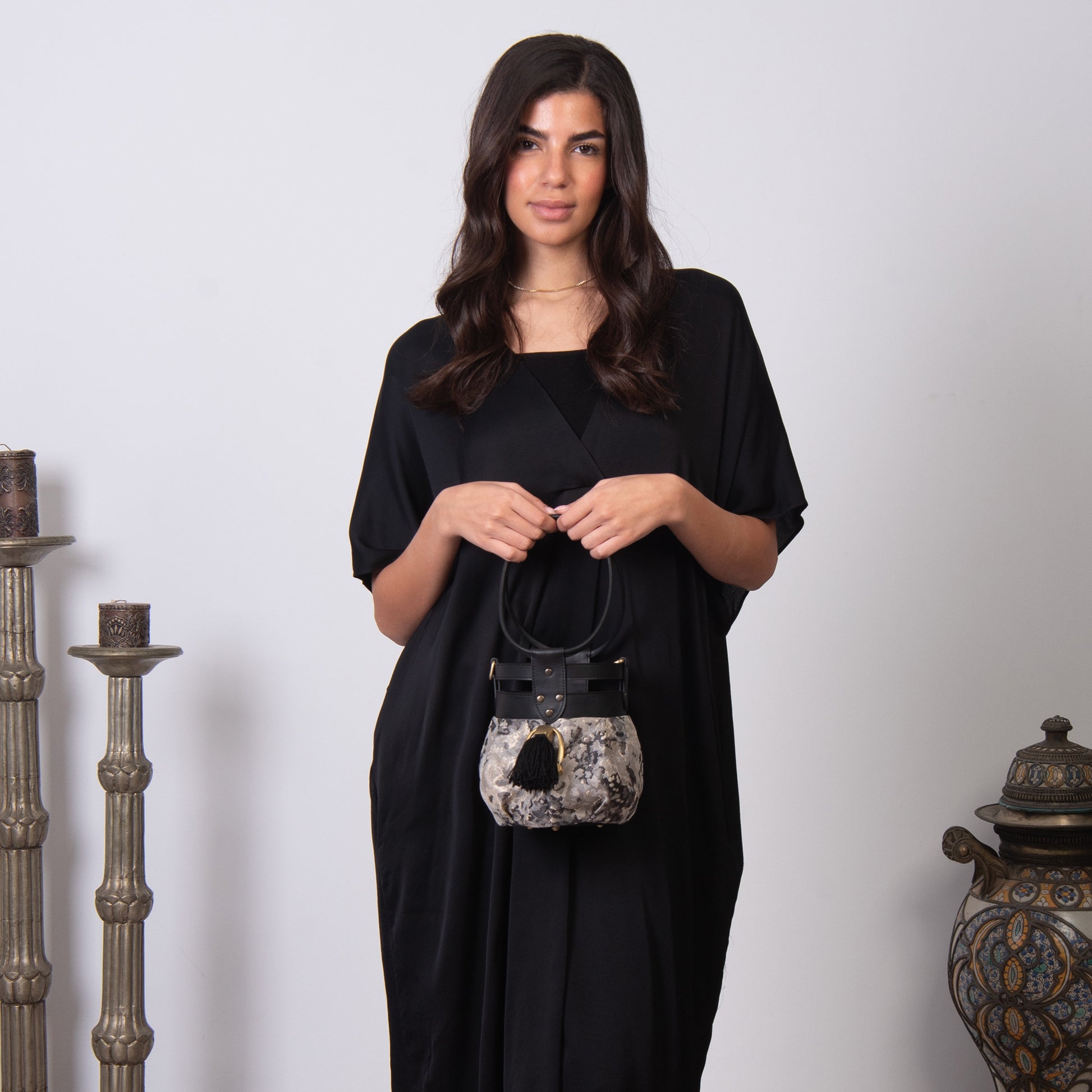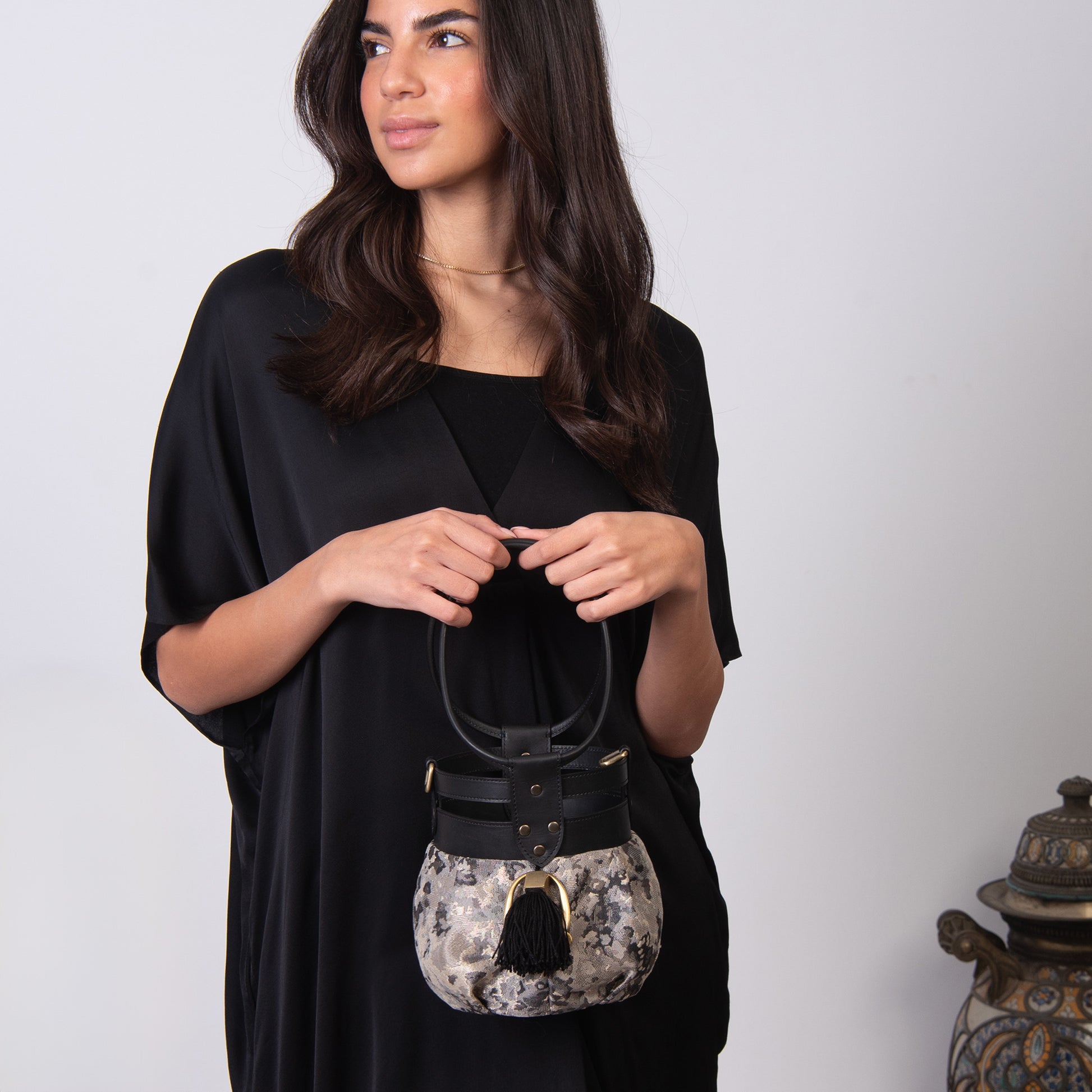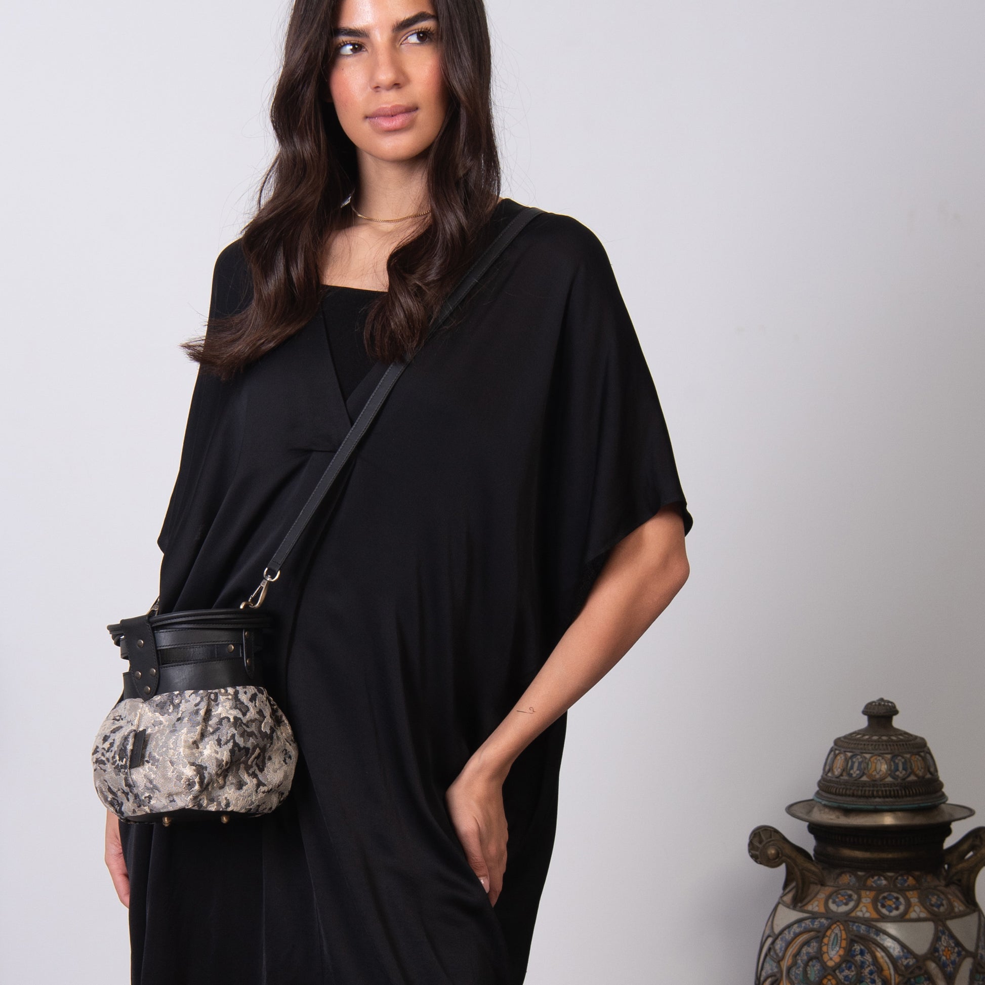 Fabric and leather in the intersection of the graceful and the tough. A round bundle that can easily be dressed up or down!