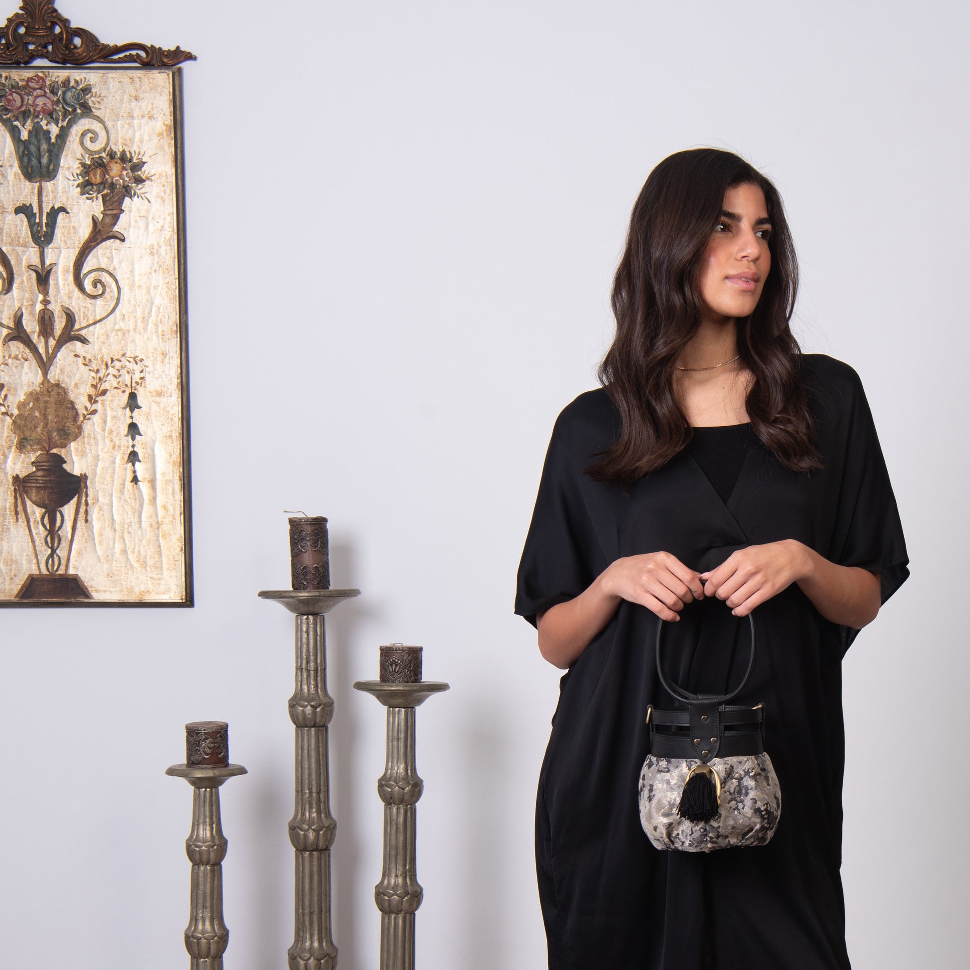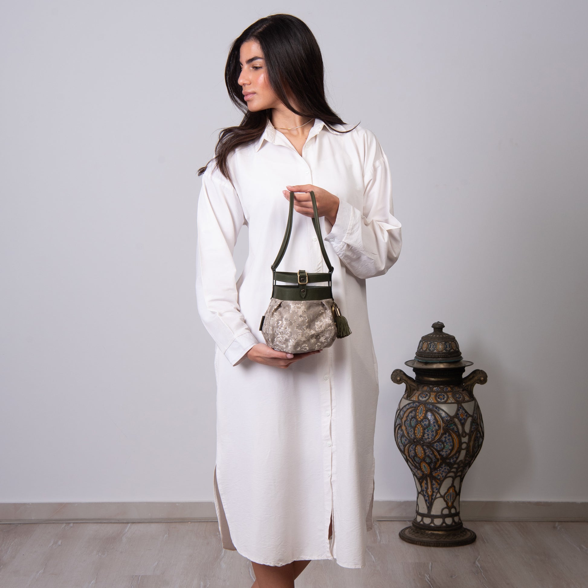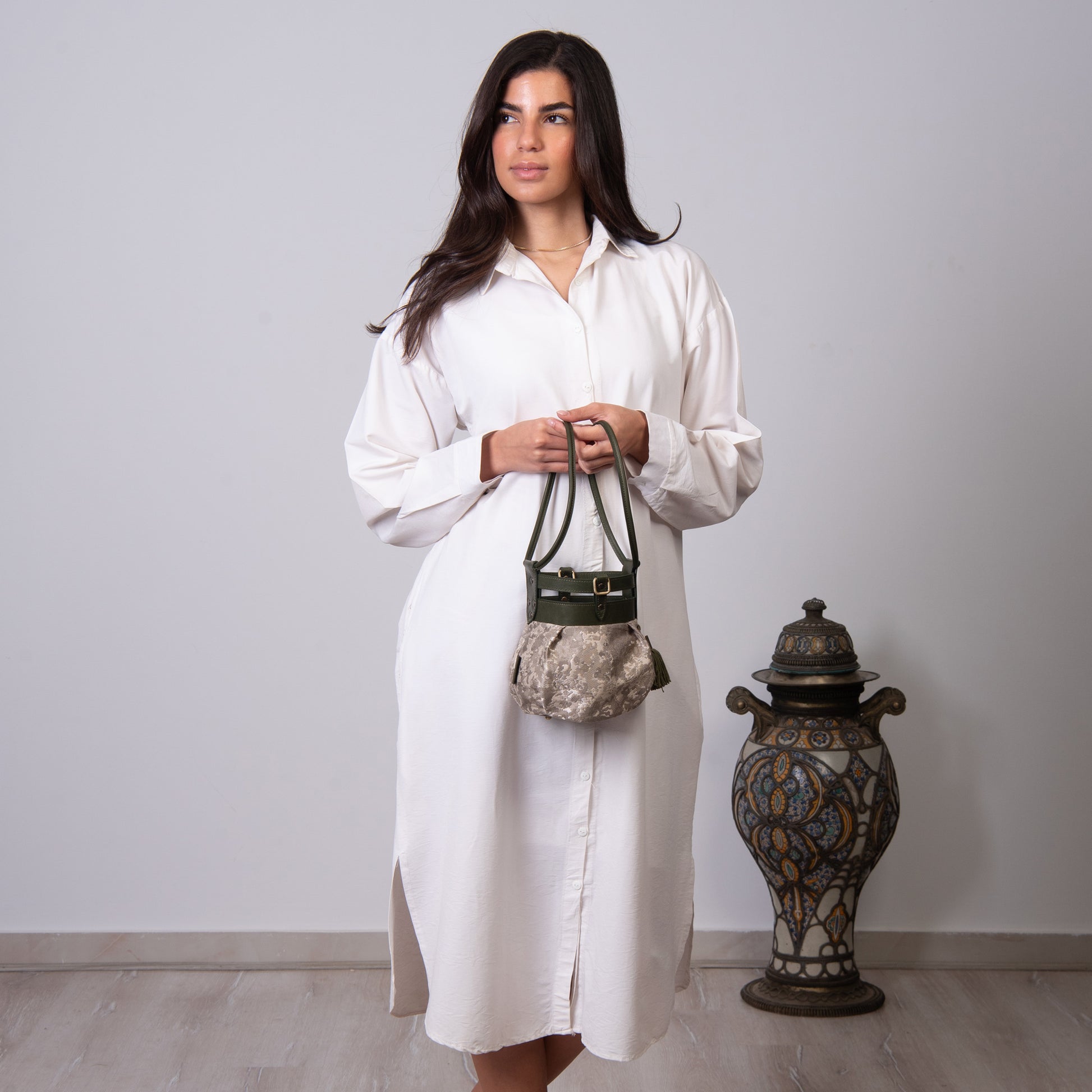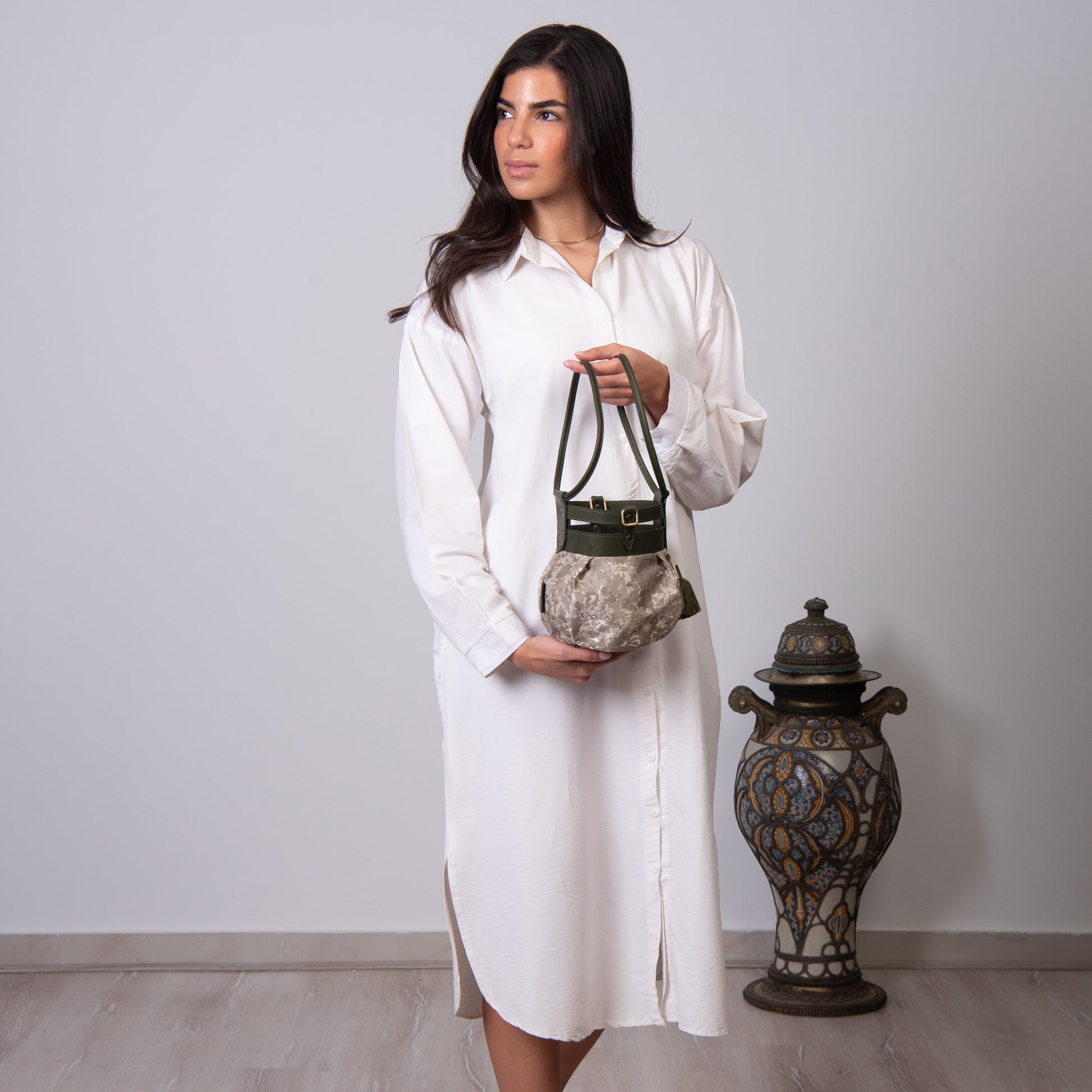 Fabric and leather in the intersection of the graceful and the tough. A round bundle that can easily be dressed up or down!