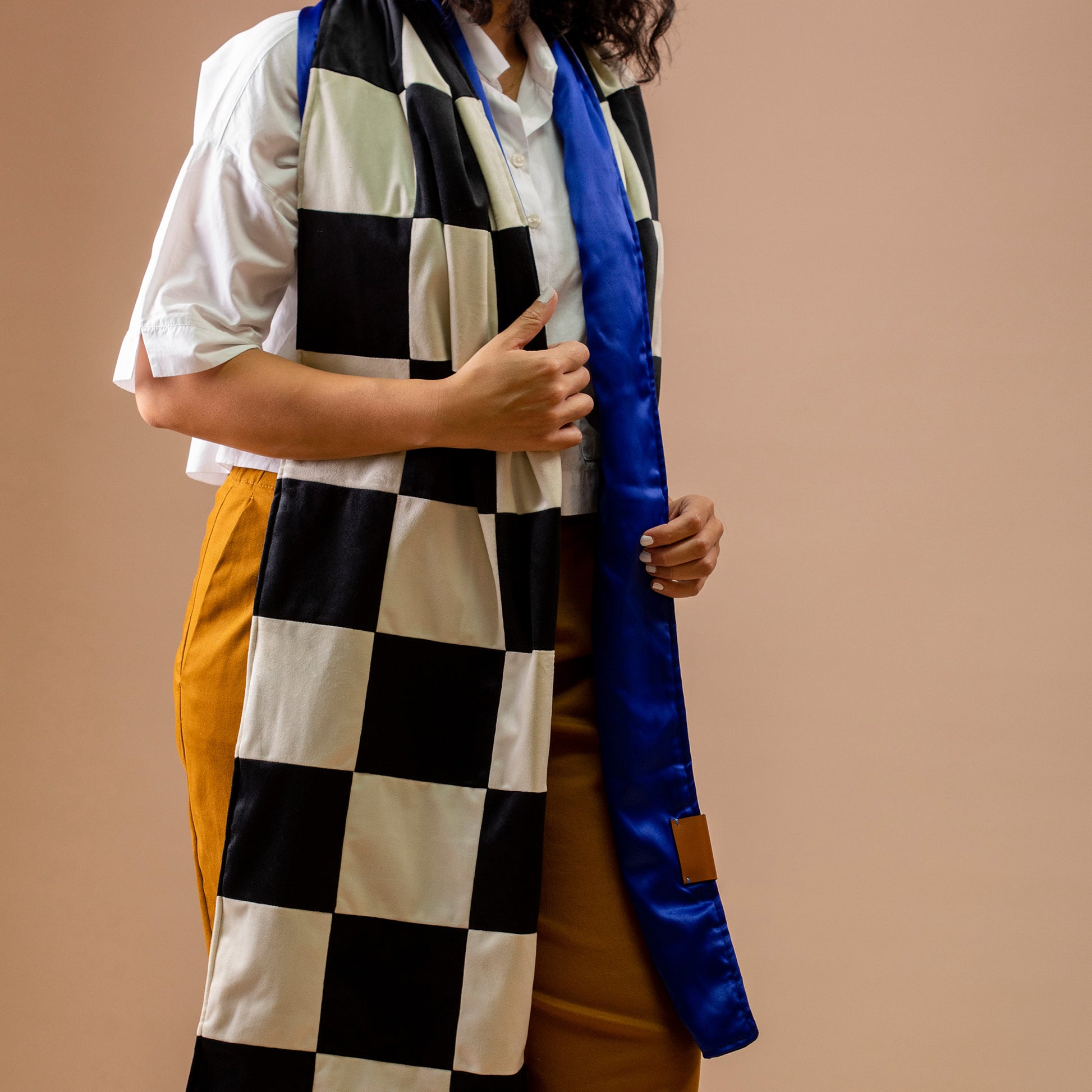 This timeless graphic of alternating black and white boxes never gets out of style, but to wrap yourself in this wool creation is to take your outfit to a whole different place - a playful yet creatively chic one! Choose between a blue or red lining..