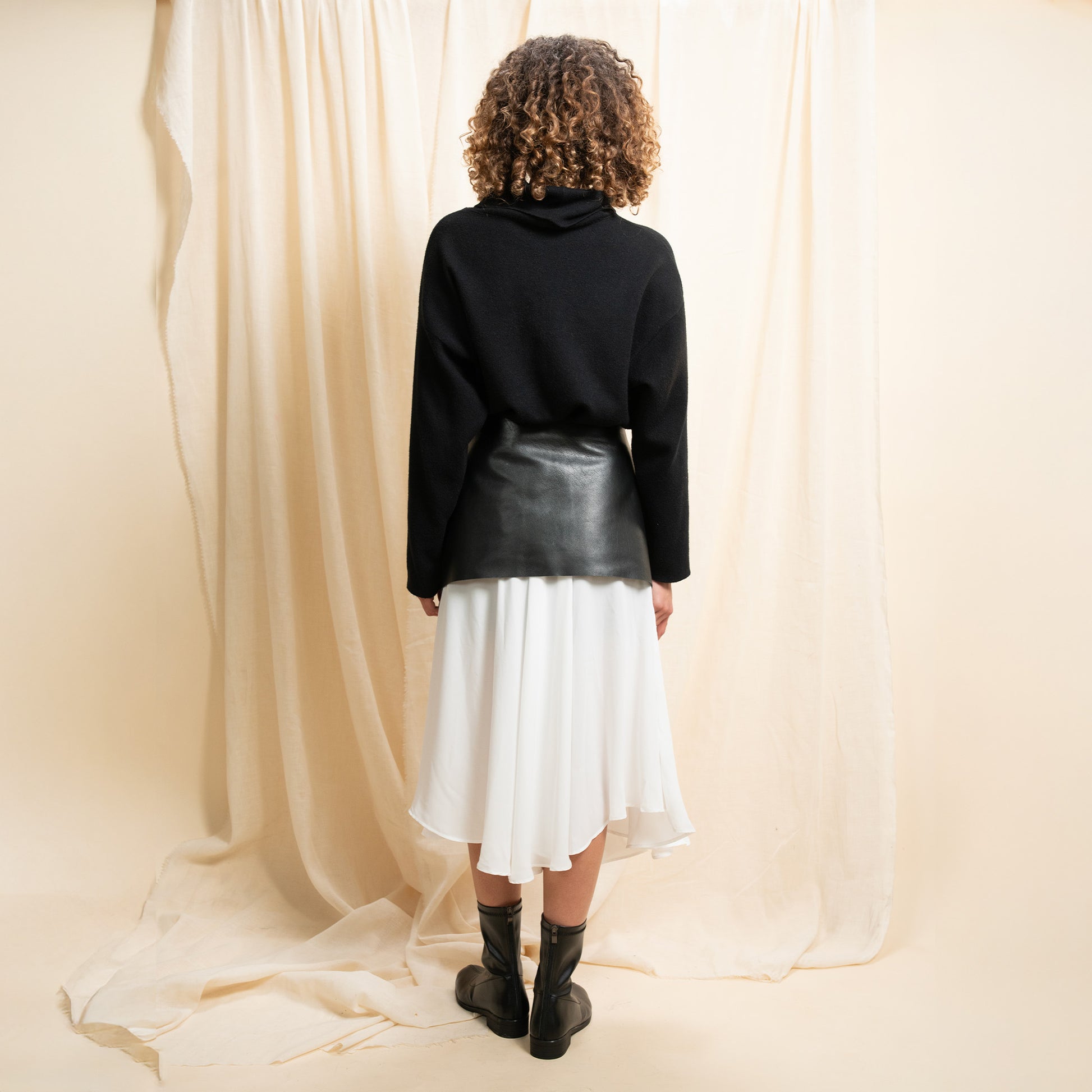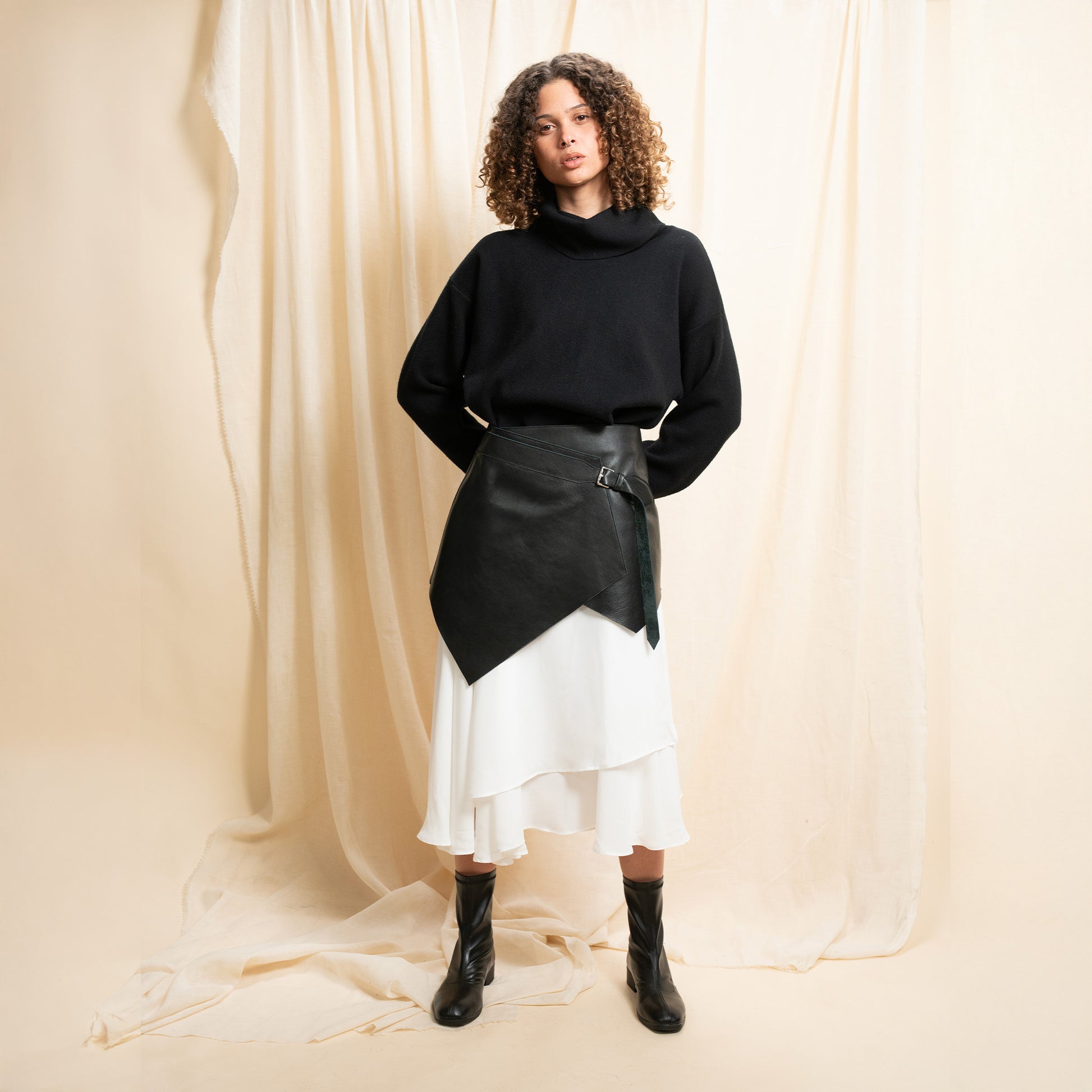 We love creating statement pieces that instantly elevate any look — meet our leather overskirts, our first step into leather garments. Edgy, bold, and undeniably cool, this versatile design works as both a skirt and a belt, giving you endless styling possibilities. Wear it your way. Pair it with our chiffon wrap skirt for a striking contrast of softness and strength — a signature expression of modern femininity.