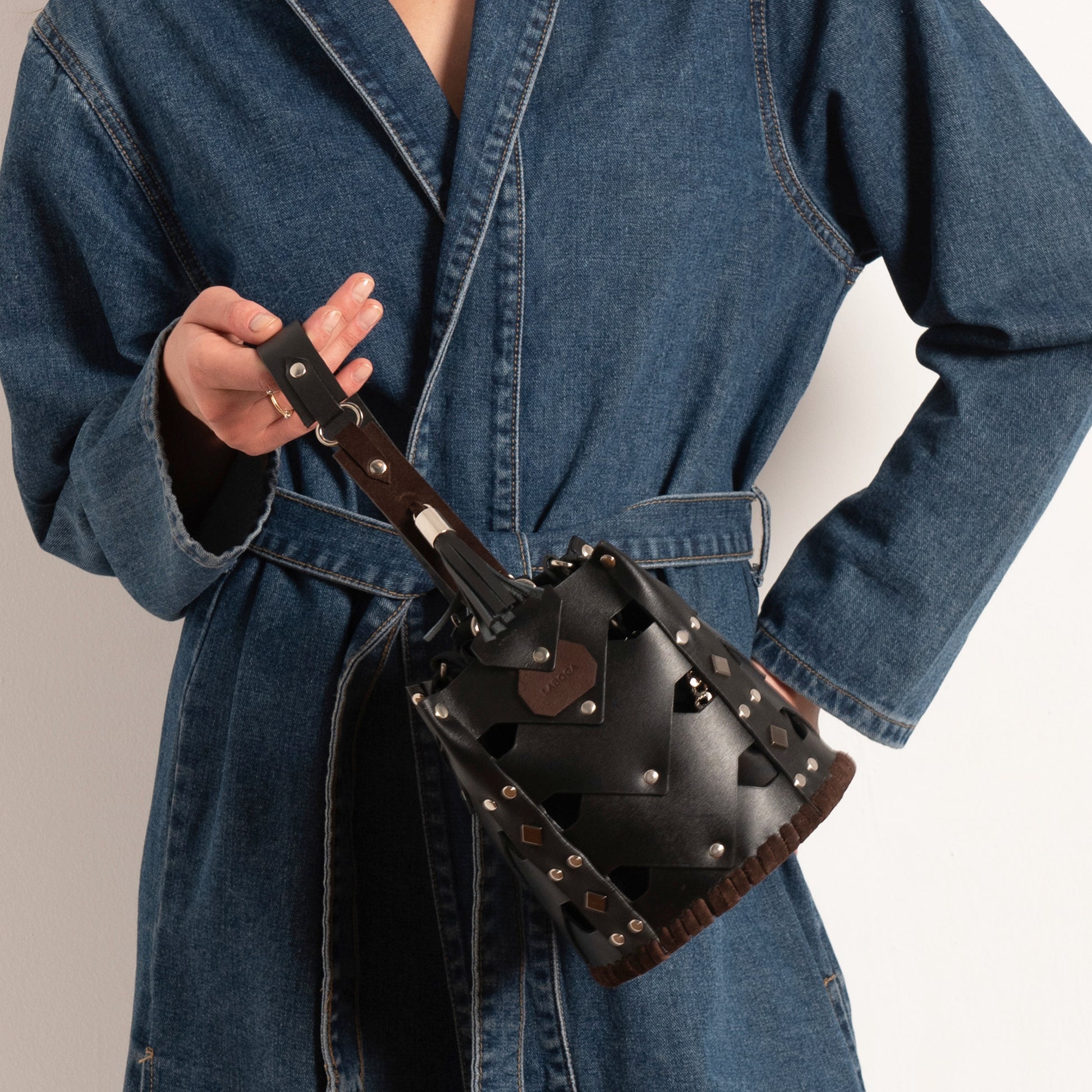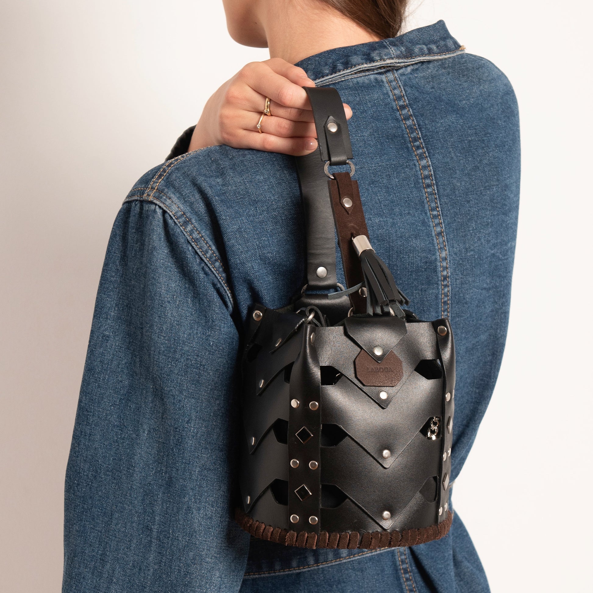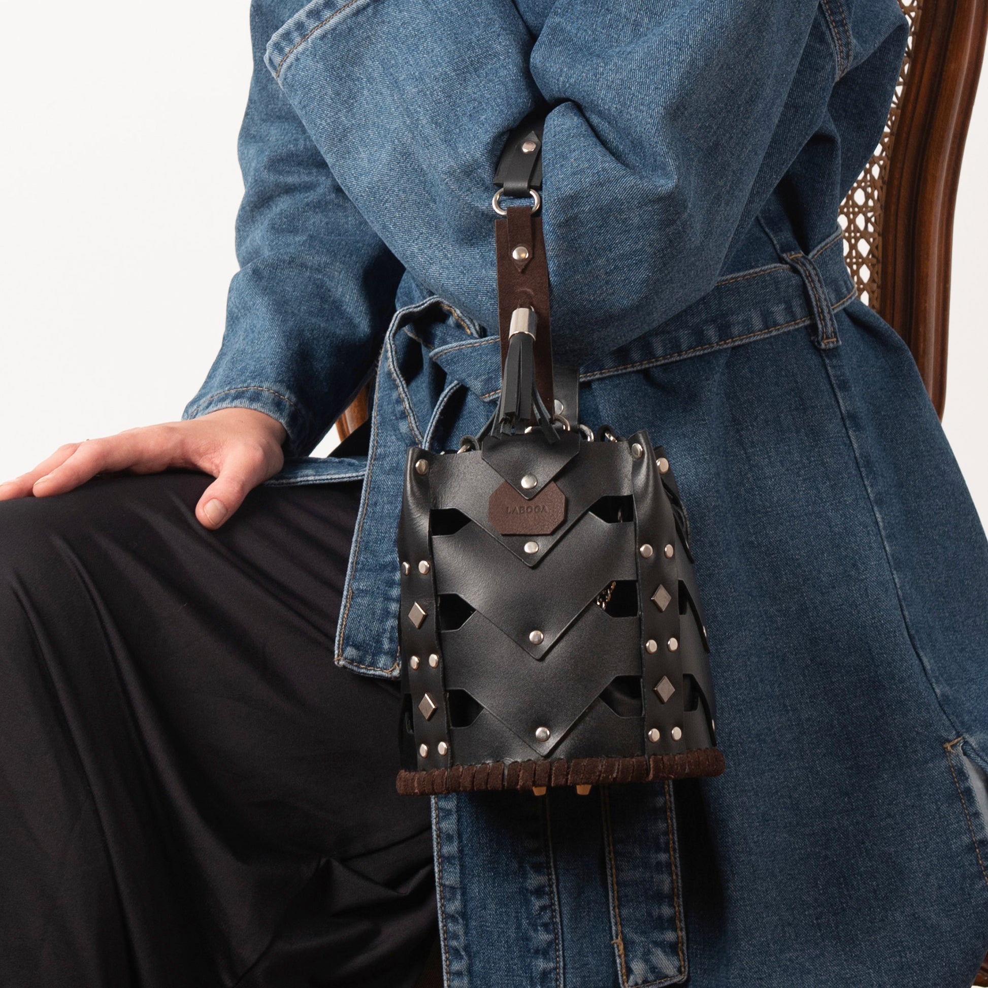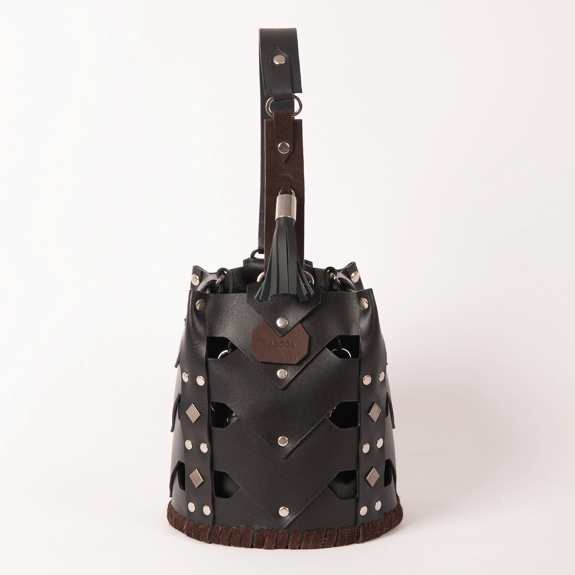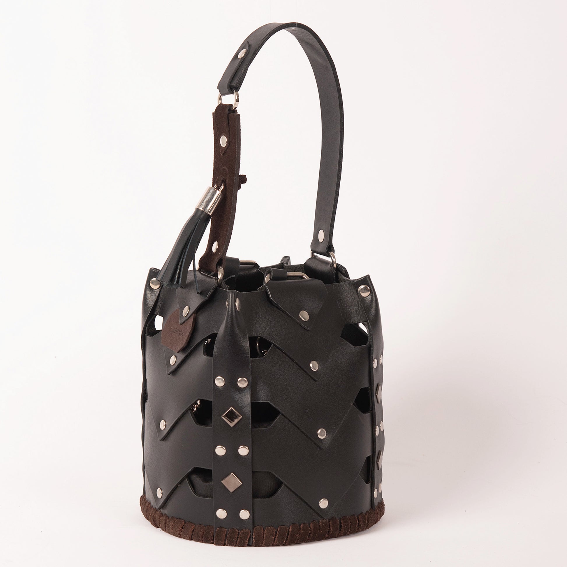 The Vertebrae Bucket is assembled by hand, using metal hardware. The roughness of the process is softened by the intricate shapes and metal details, yielding a unique, bejeweled piece.