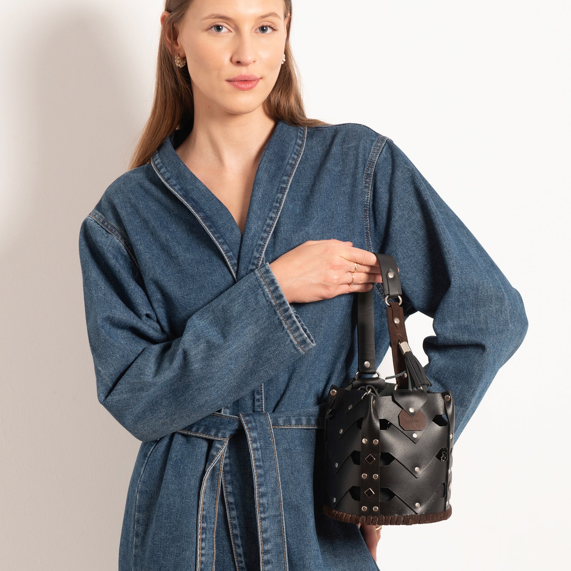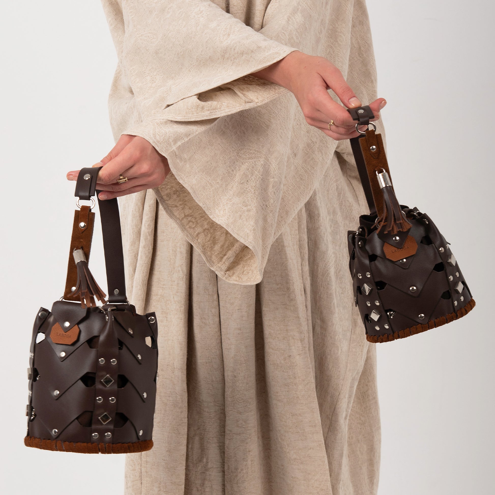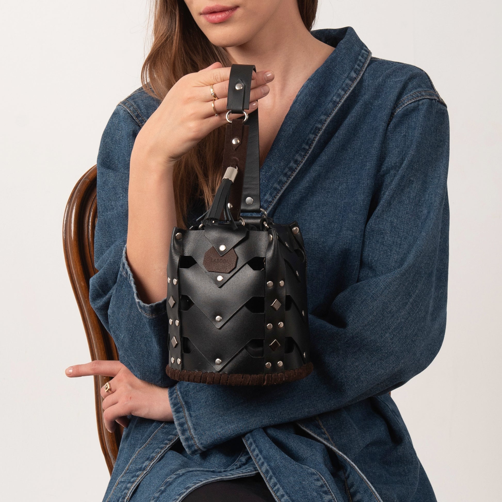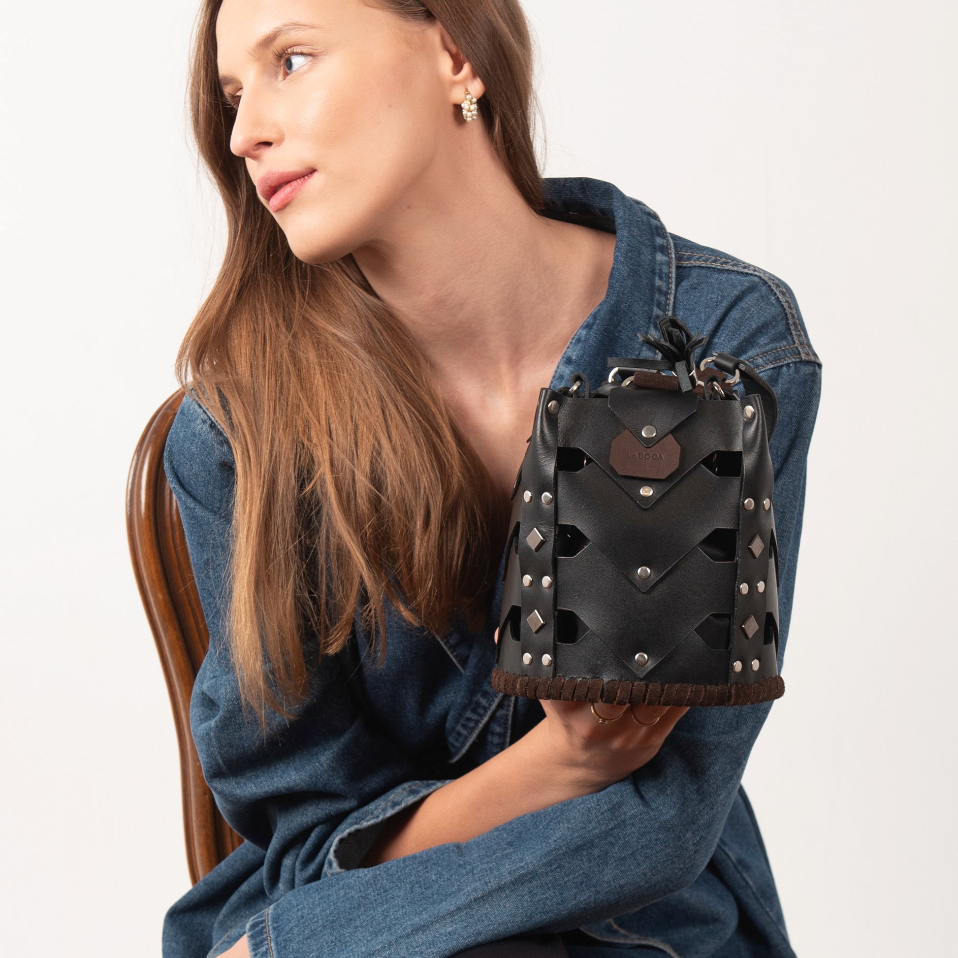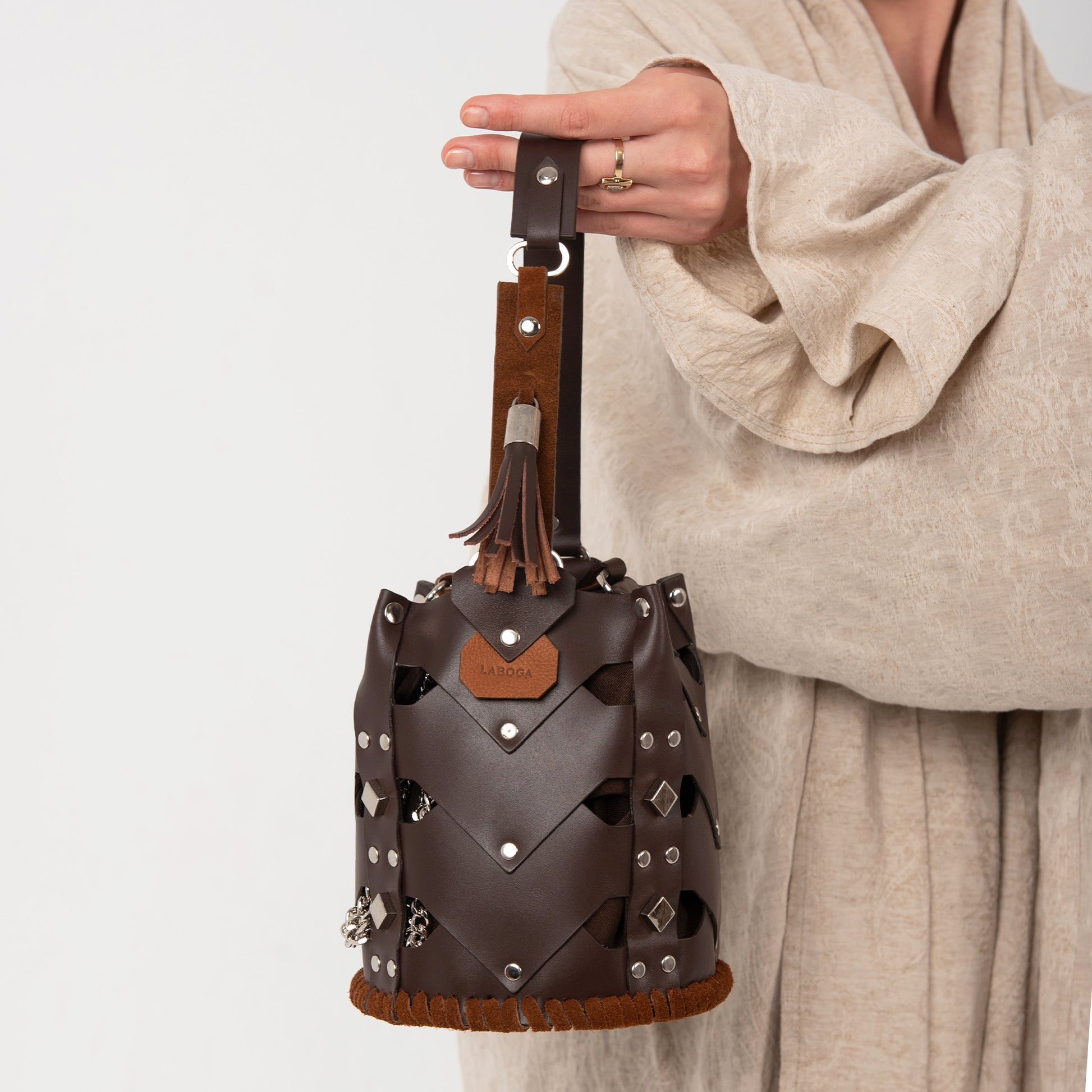 The Vertebrae Bucket is assembled by hand, using metal hardware. The roughness of the process is softened by the intricate shapes and metal details, yielding a unique, bejeweled piece.