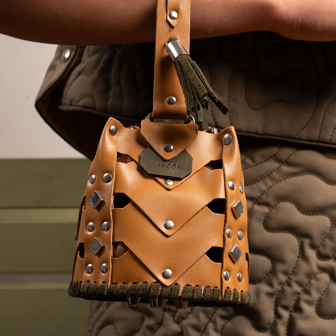 The Vertebrae Bucket is assembled by hand, using metal hardware. The roughness of the process is softened by the intricate shapes and metal details, yielding a unique, bejeweled piece.