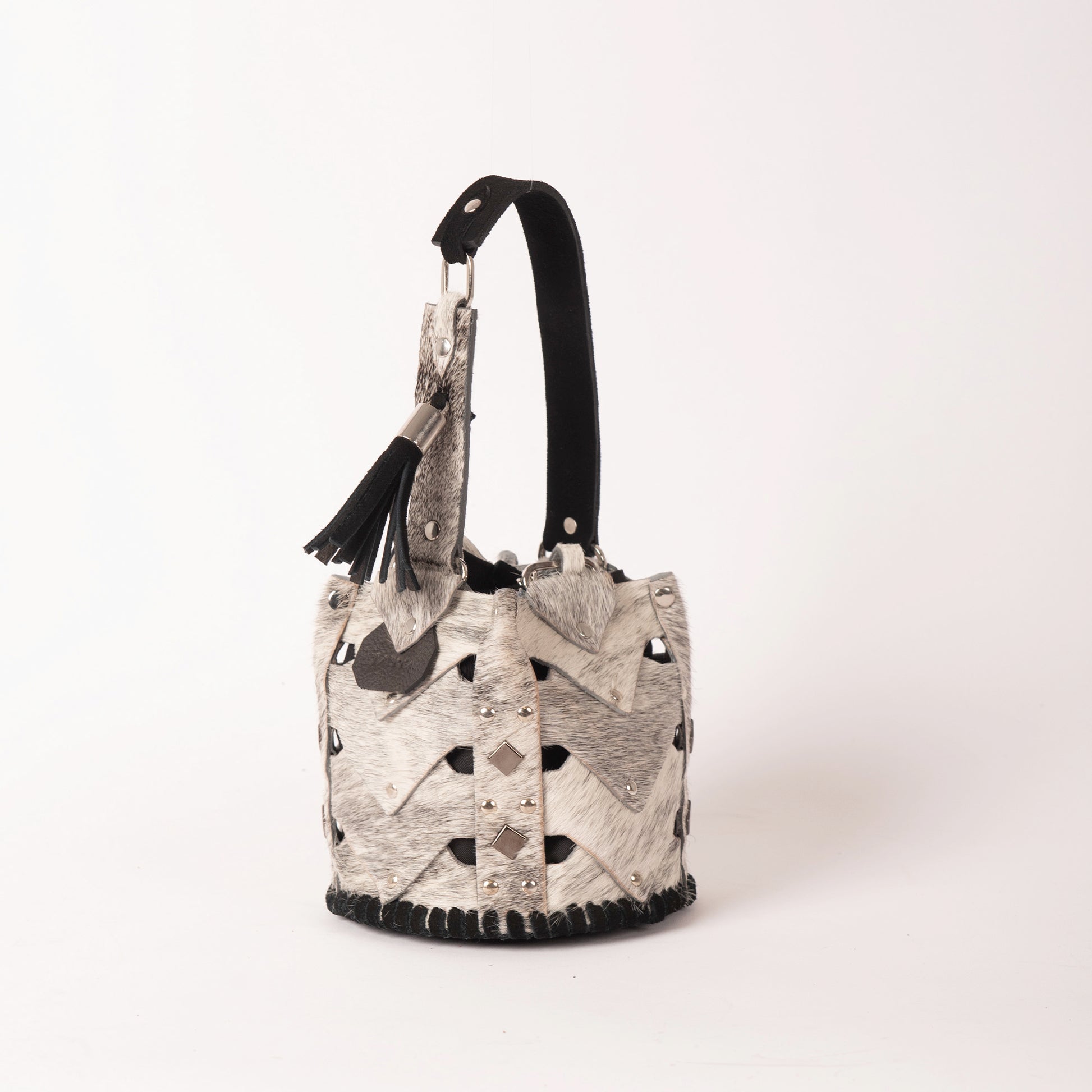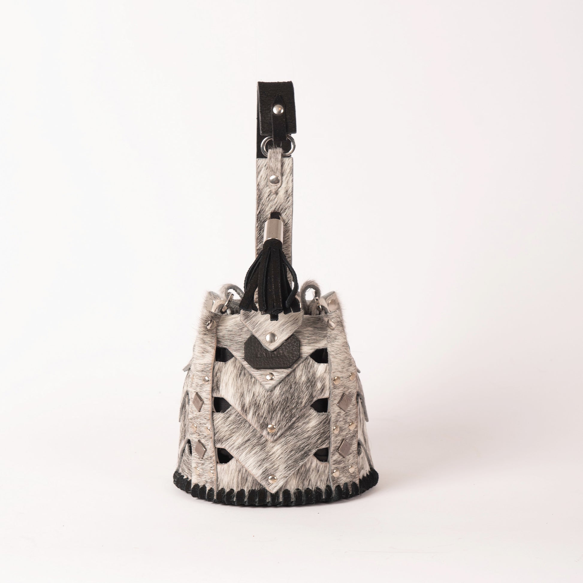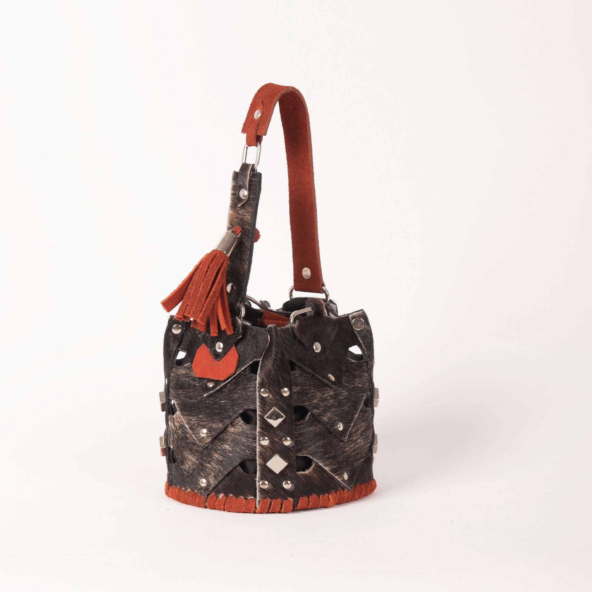 The Vertebrae Bucket is assembled by hand, using metal hardware. The roughness of the process is softened by the intricate shapes and metal details, yielding a unique, bejeweled piece.