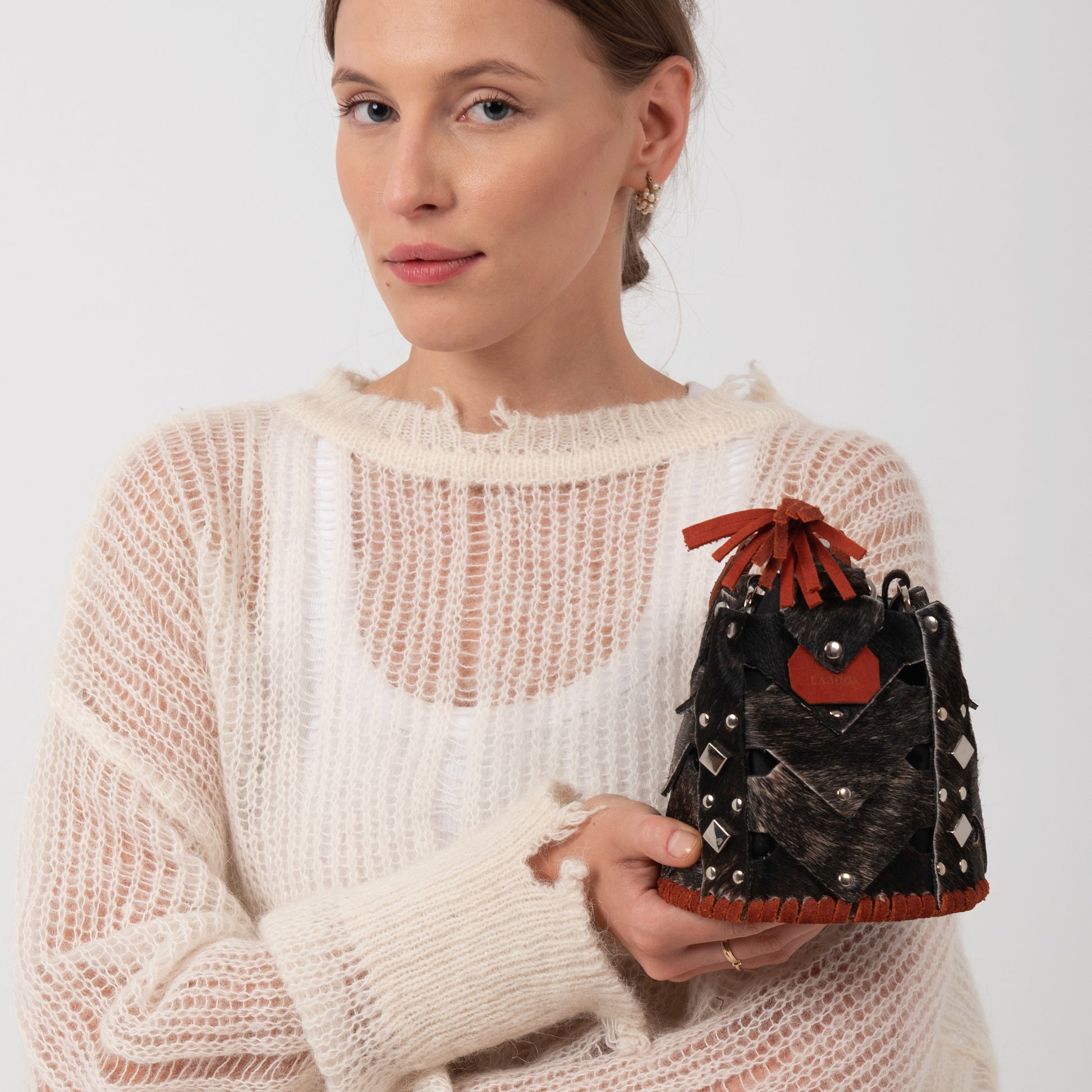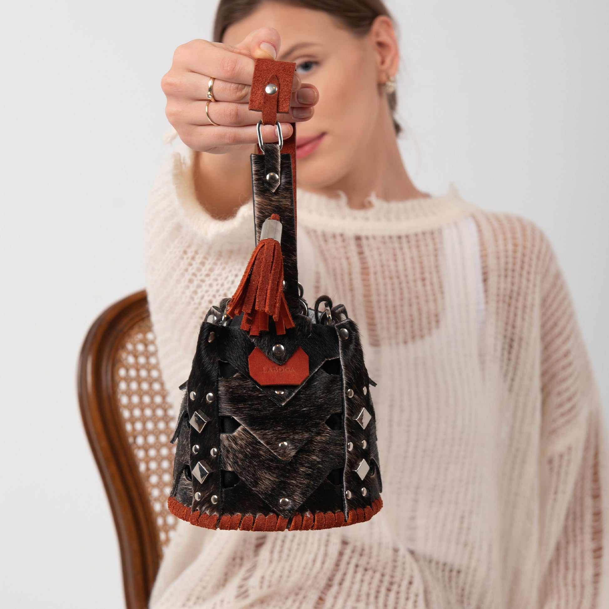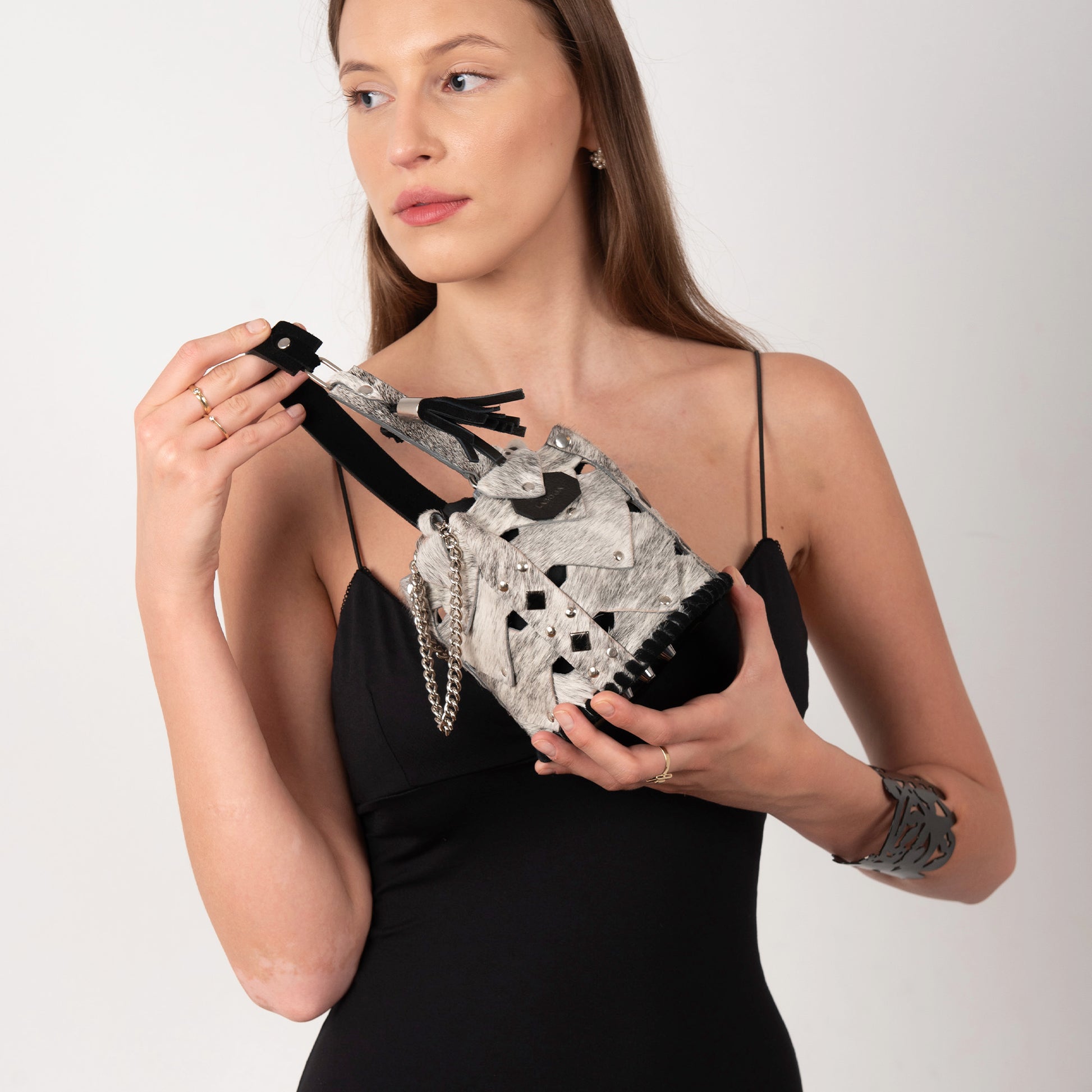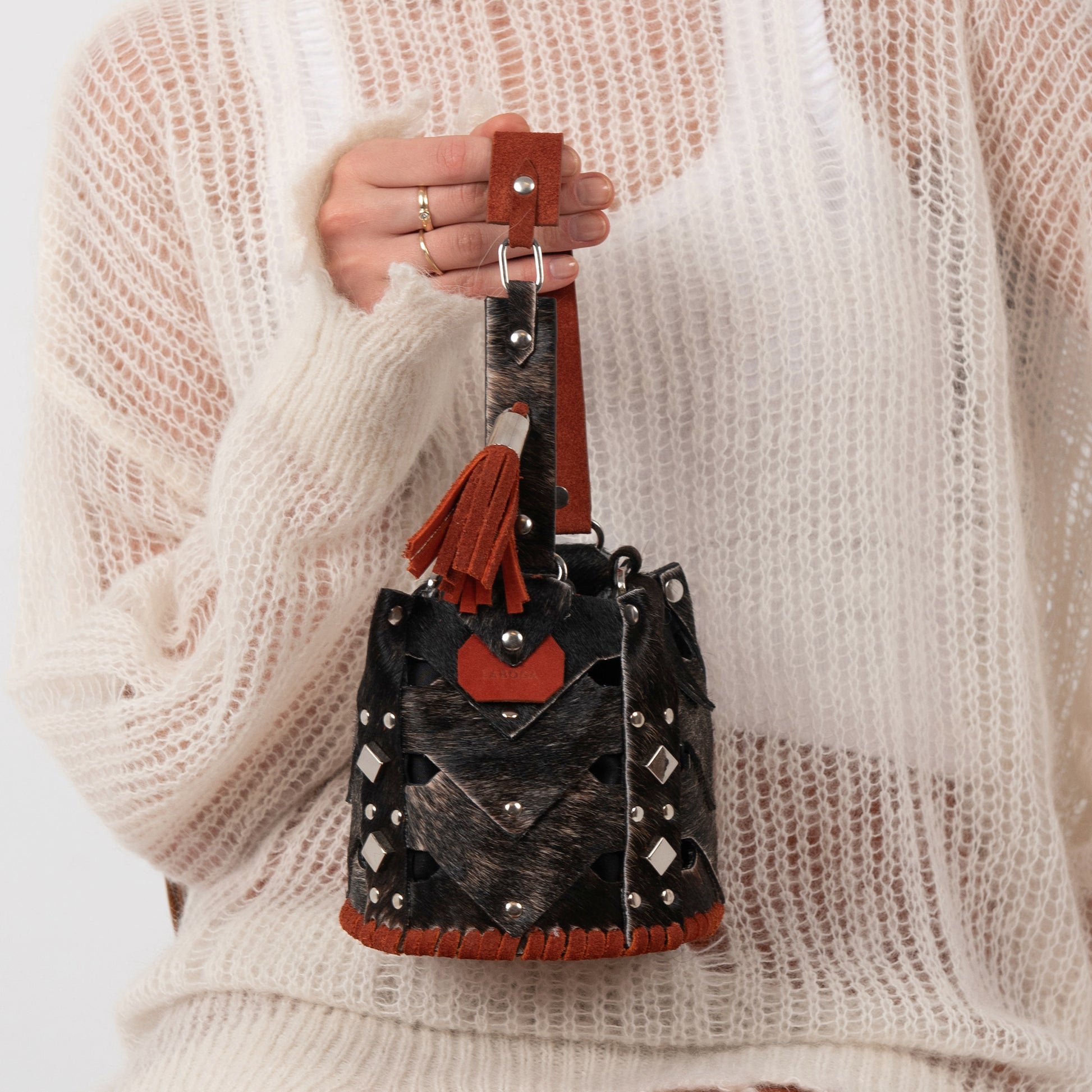The Vertebrae Bucket is assembled by hand, using metal hardware. The roughness of the process is softened by the intricate shapes and metal details, yielding a unique, bejeweled piece.