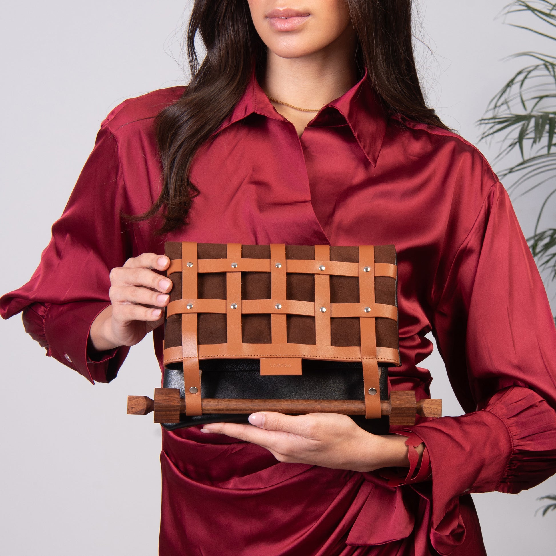 Hand assembled straps of leather, a hand-shaped Arabesque-inspired handle, and a 2-way hand-held design.