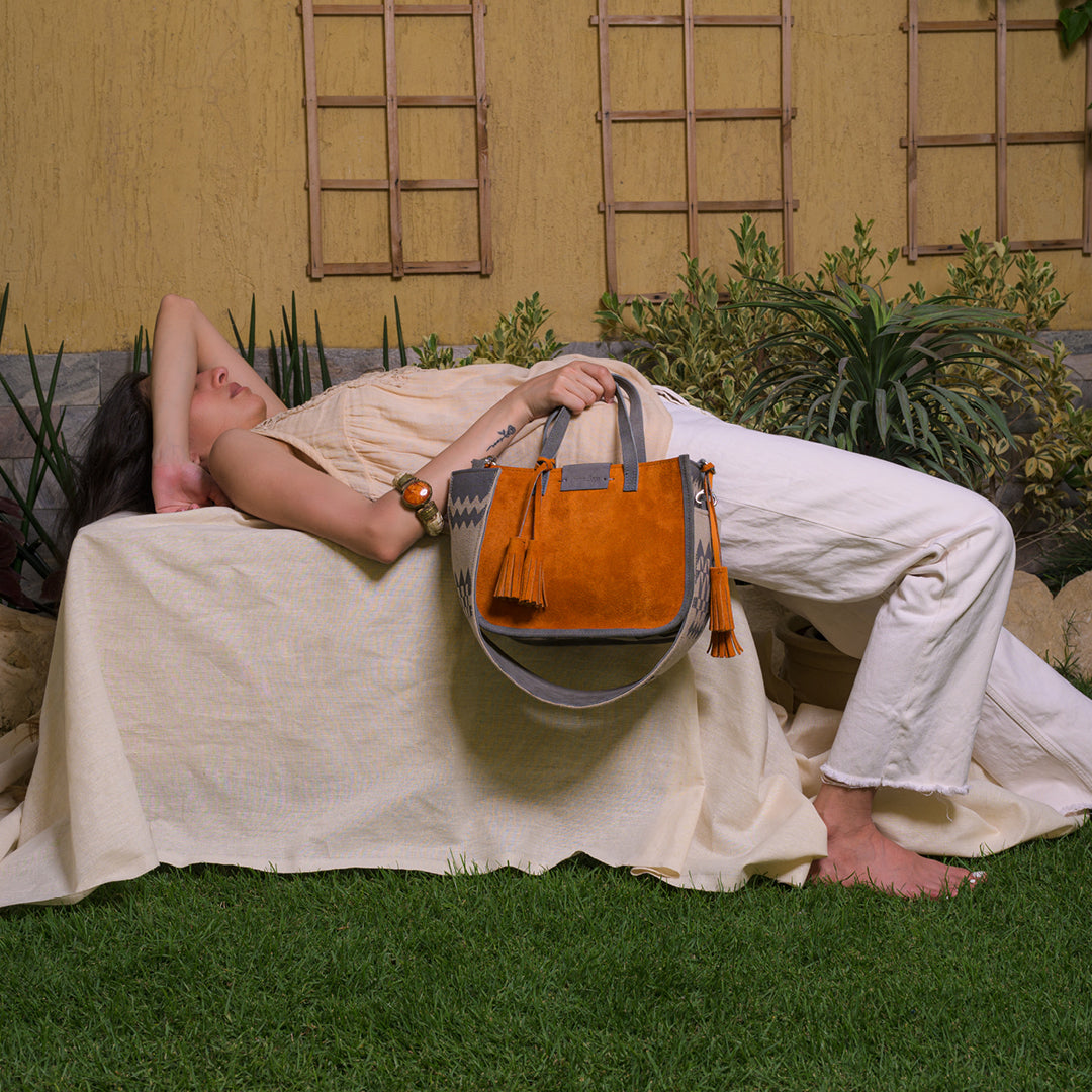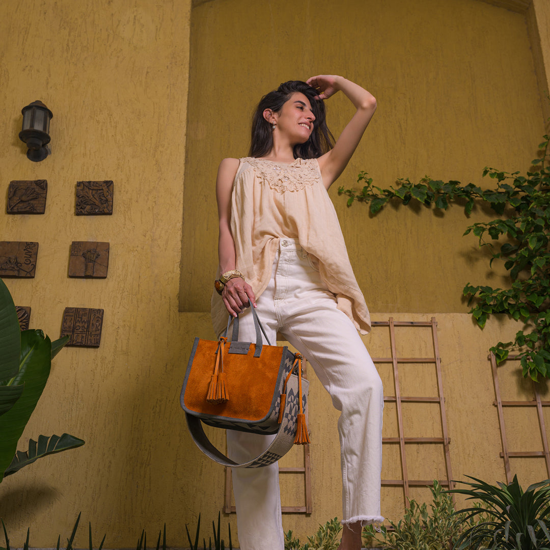 Our summer custom primitive print has found its way to the side of this bag, and continued onto the statement wide strap to balance the bold neutral pattern with the solid colors in the front and back of the bag!