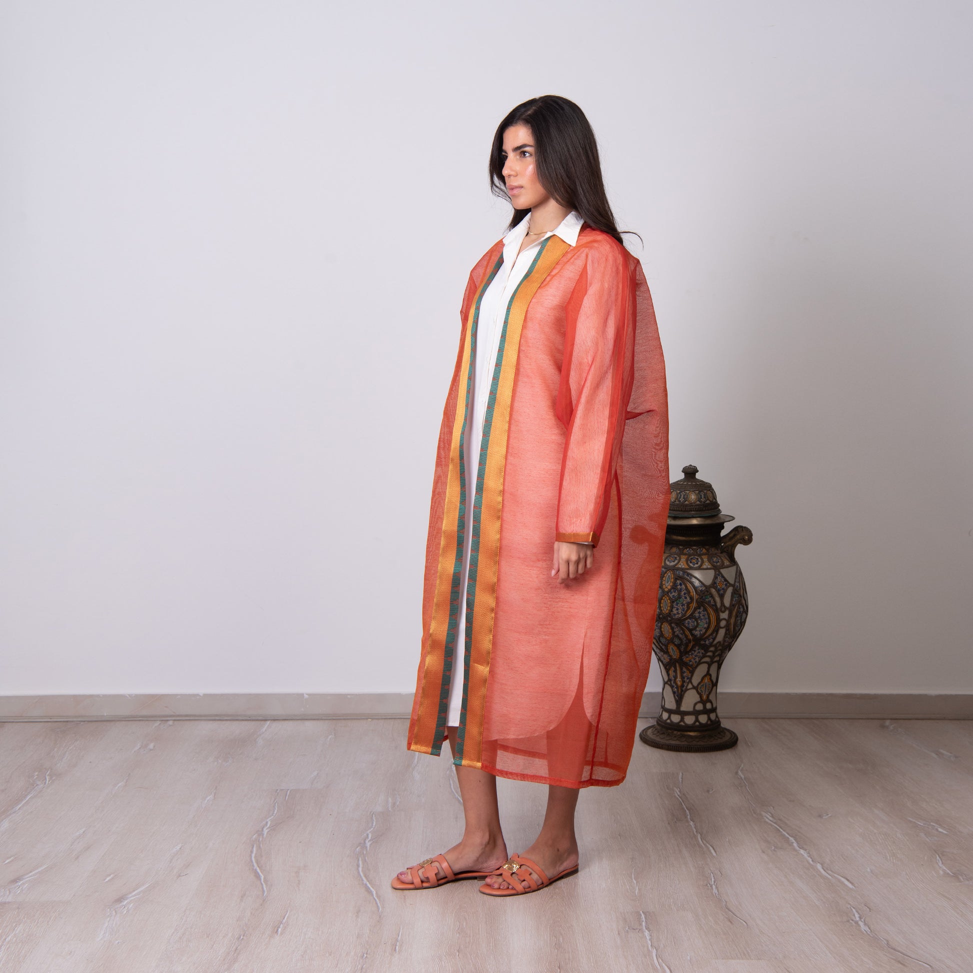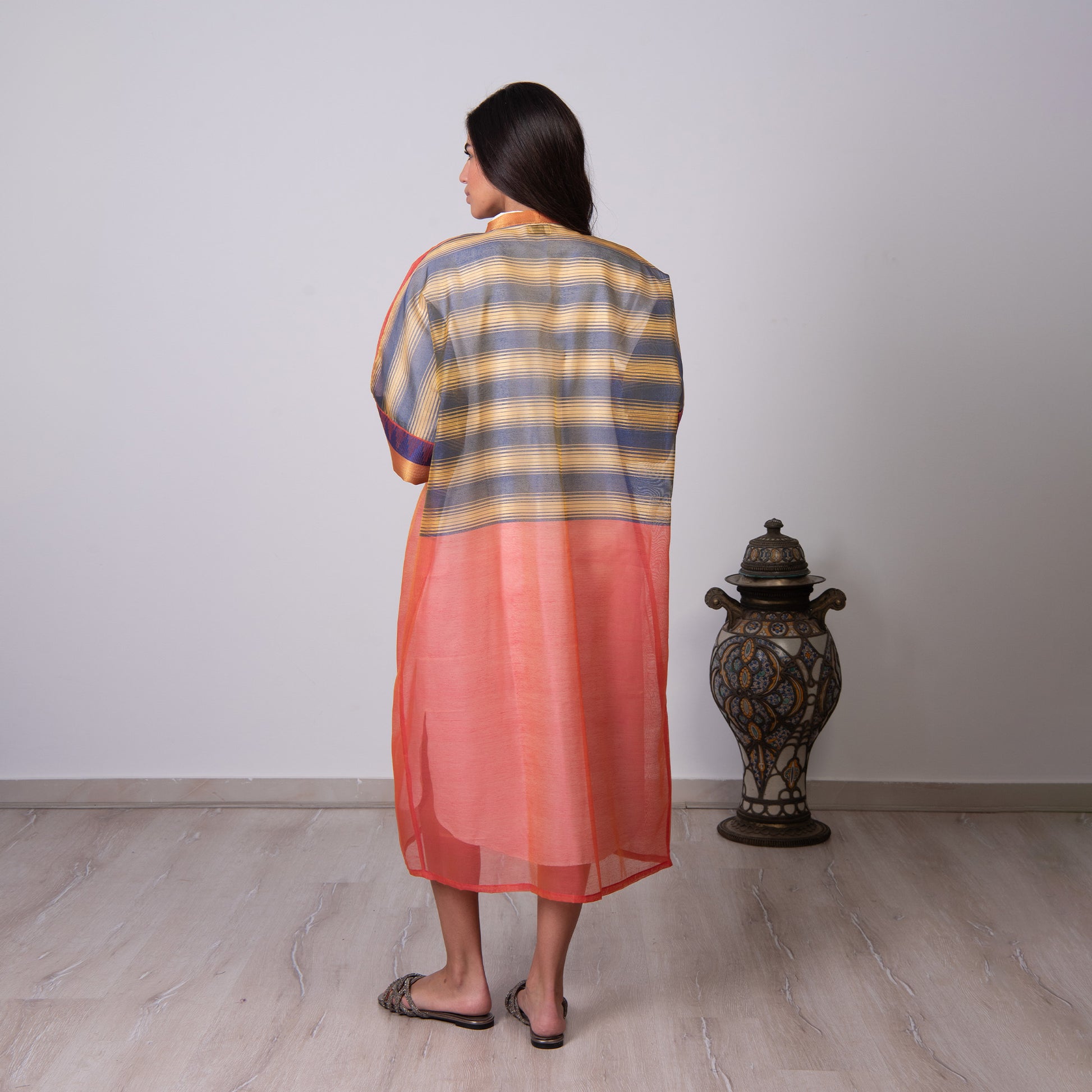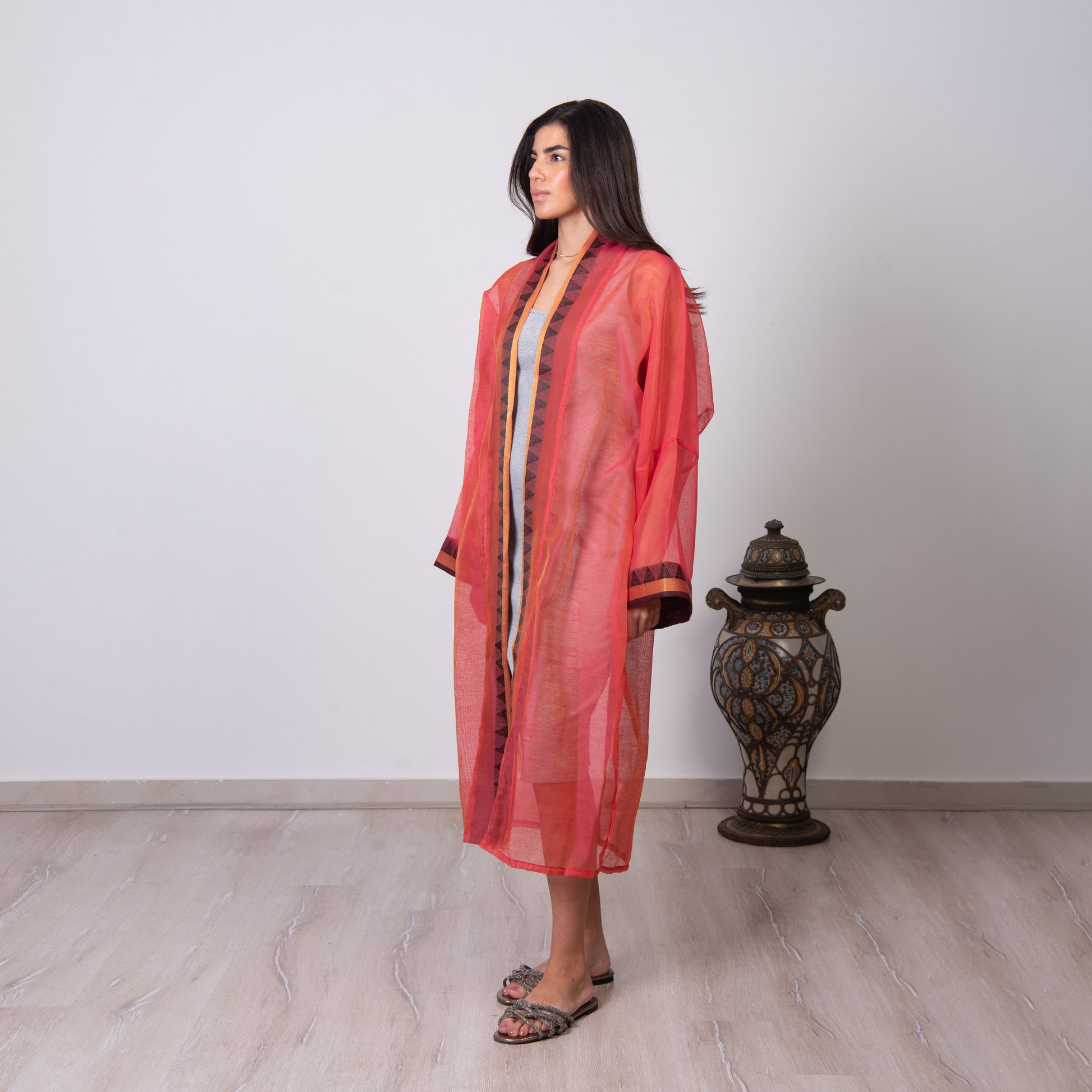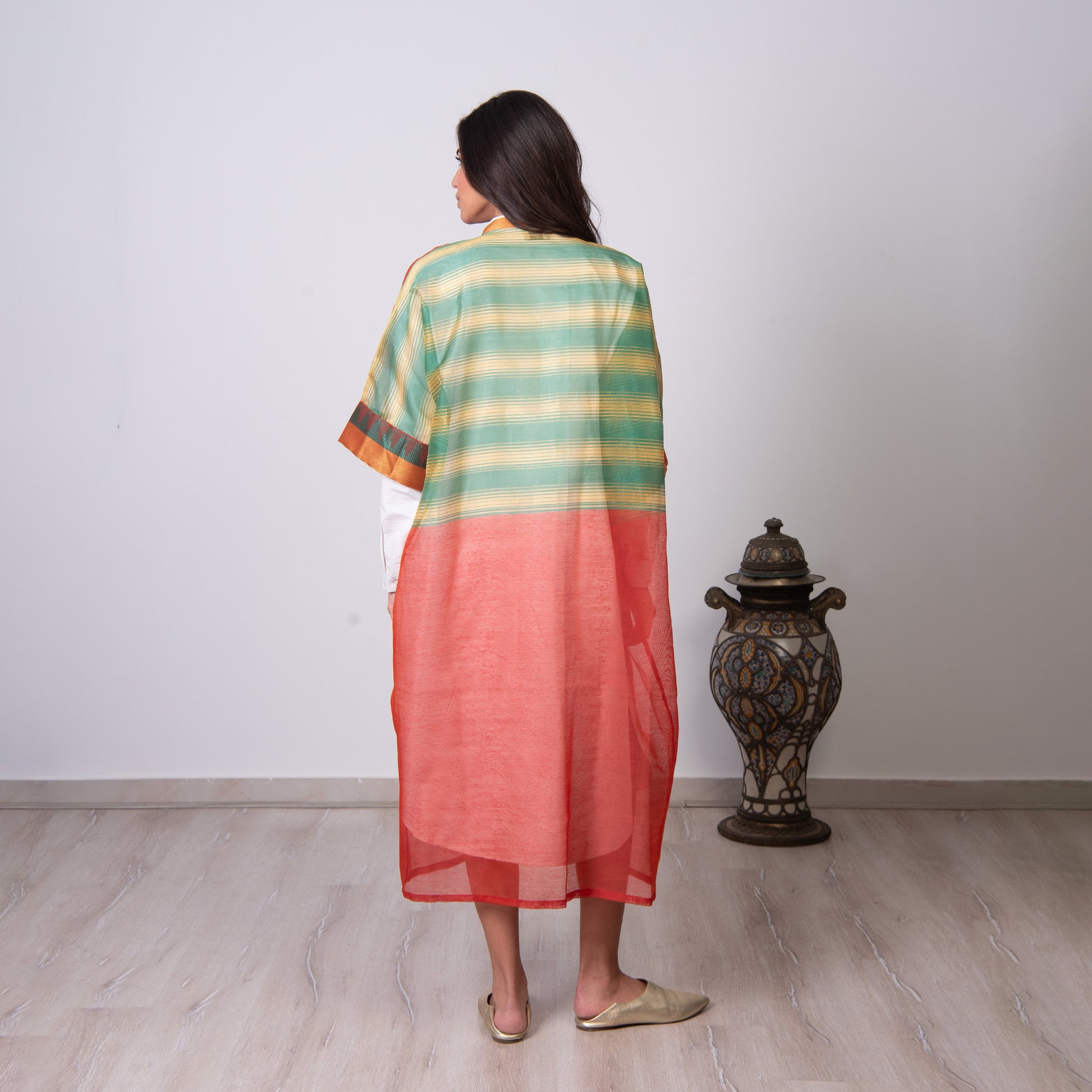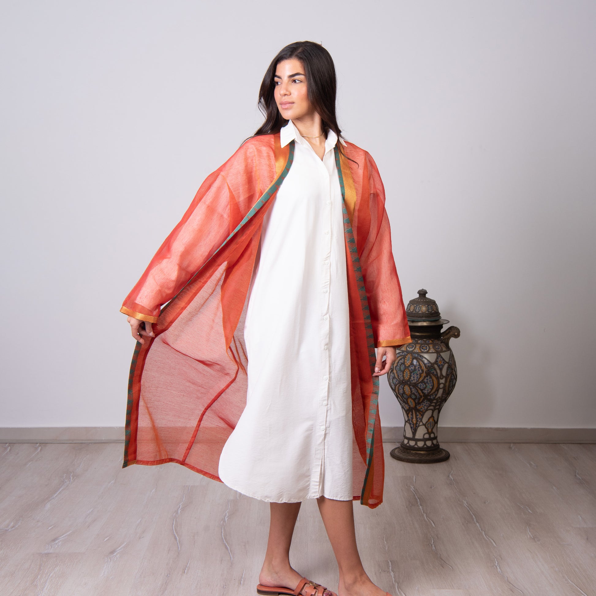 Lightweight and expressive, this kimono is designed to bring effortless elegance to your everyday style. Crafted from Indian fabric, it features a fluid silhouette that drapes beautifully with every movement. The soft translucent texture is enhanced by contrasting trims and subtle woven details, creating a delicate balance between modern design and timeless sophistication. Perfect for layering, this piece adds a refined and graceful touch to any look.